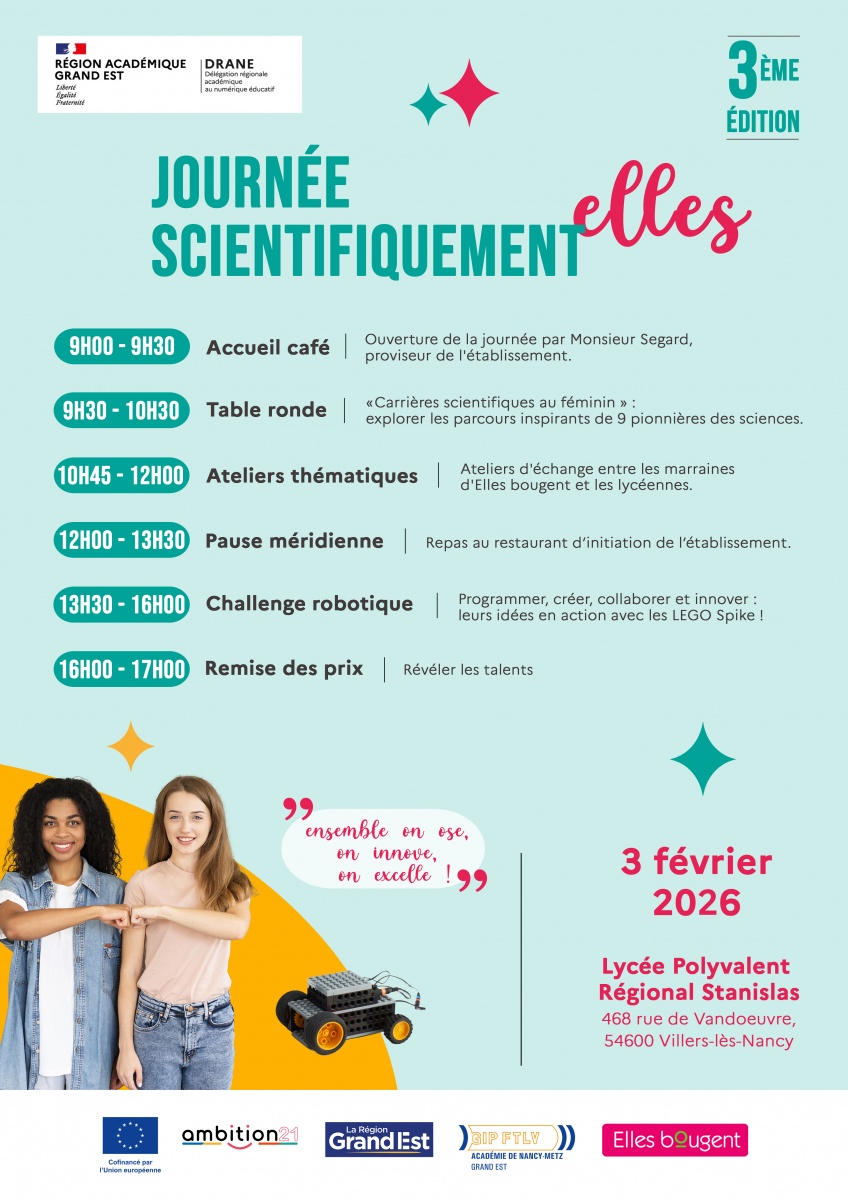 La délégation Régionale Elles Bougent et la DRANE (Délégation de région académique au numérique éducatif) ont le plaisir de vous inviter à donner votre témoignage le 03 février 2026 au Lycée polyvalent régional Stanislas de Villers-Lès-Nancy.
